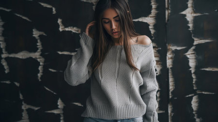 Favorite sweater Attractive young woman touching her sweater and keeping eyes closed while standing against grey background : Generative AI