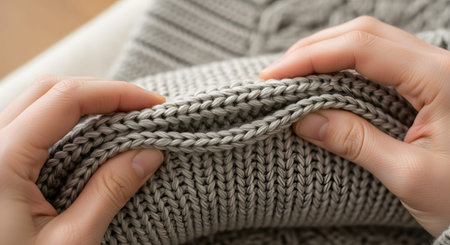 A detailed close-up shot of hands gently pulling at the seam of a grey knitted sweater or fabric. The image highlights the texture, stitch quality, and elasticity of the wool material, focusing on textile craftsmanship.