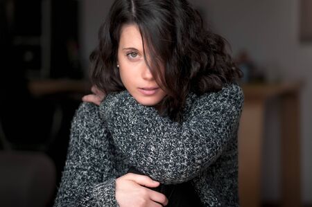 Woman indoor portrait. Young beautiful woman in warm knitted clothes at home. fashion.