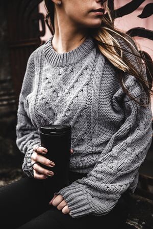 young beautiful girl in a warm knitted sweater and boots posing on the street