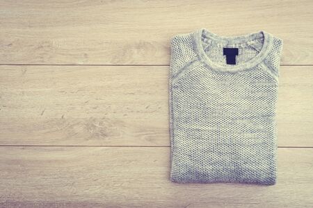 Top of view gray sweater on wooden background - Vintage Filter Processing