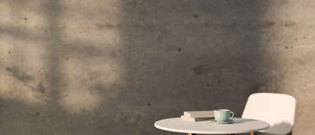 3D rendering, white coffee round table with cup, books and chair in concrete wall background, 3D illustration