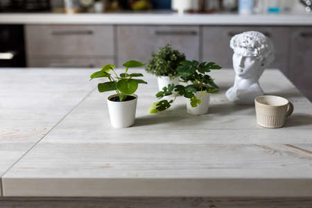 Artificial miniature copies of monstera and tropical plants with the head of David and a small coffee gray cup are on a wooden table in a beige kitchen interior