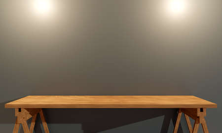 Dark interior for your design. Wooden table for your design on a dark concrete wall. 3d render