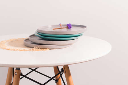 Handmade dishes stacked on a table, minimalist decoration in the Nordic style