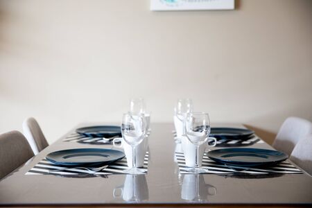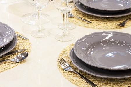 Table setting. Close-up photo of empty glasses, plates and spoons in a restaurant. Beautiful table setting wait for guests