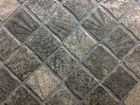 Old grey tile brick wall background texture close up
