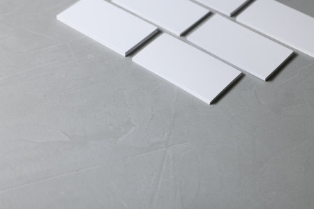 Blank business cards on light gray textured table, closeup. Mockup for design