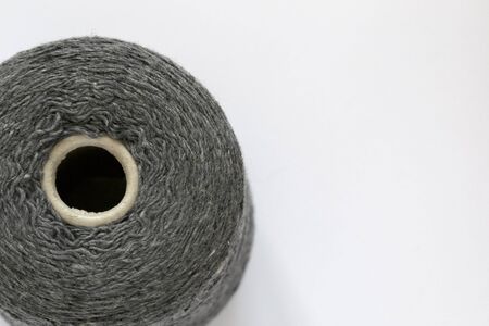 Bobbin of grey threads for hand and machine knitting close-up. Background top view, space for text.
