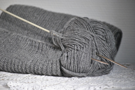 A peace of gray knitting with knitting needles. Female hobby and leisure knitting concept.