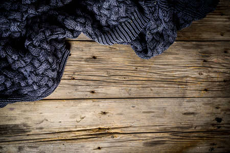 Cozy autumnal background, old rustic wooden table with a warm blanket, copy place for text