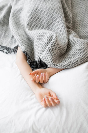Bed Hands Protruding Blanket Woman Covered Sleeping Fatigue Loneliness Isolation Introvert Concept