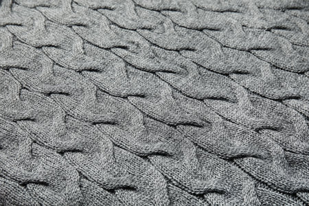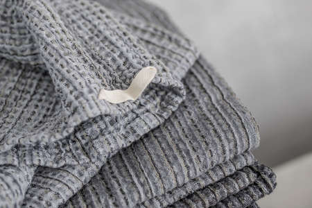 Fragment of gray plaid knitted from wool, close-up of folds, you can see the mating, the structure of the fabric, the pattern in the form of pigtails and stripes. The folds are large thick.