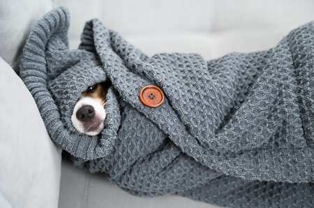 Jack Russell Terrier lies wrapped in a blanket. A dogs nose sticks out from under a blanket
