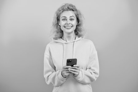 Using phone in shopping. Woman work online. Millennial woman chatting online isolated blue. Business chatting communication. Online shopping. Woman use phone. Girl chatting in blog.