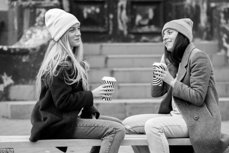 love you. happy winter holidays. Students friendship. girls in beanie. seasonal shopping. winter clothing fashion. down jacket. selfie time. women in padded warm coat. xmas vacation