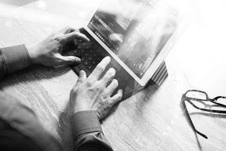 Businessman hand working concept. Photo investor working with new startup project. Digital tablet keyboard dock screen computer design smart phone using. Eyeglass on marble desk. Sun flare effect. black white