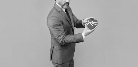 cropped senior businessman in suit hold heart present box on grey background, purchase