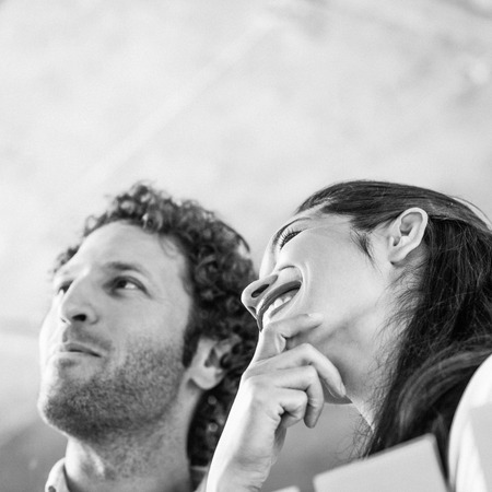 Portrait of a loving couple on the street. Black and white photo.