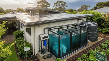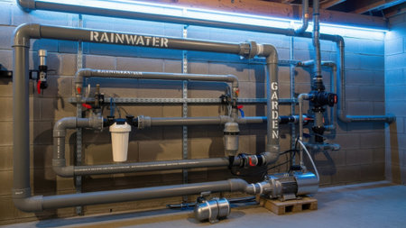 Rainwater harvesting system collects and filters water. Sustainable water management solution for home and garden irrigation.