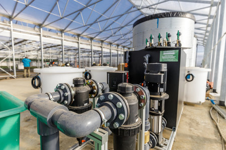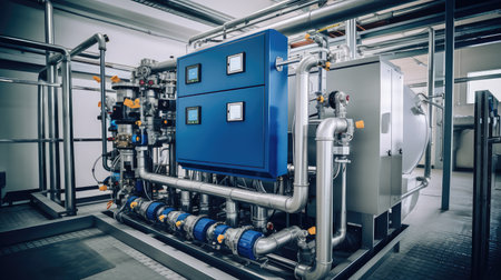 Large industrial water treatment and boiler system in a greenhouse with many pipes and valves