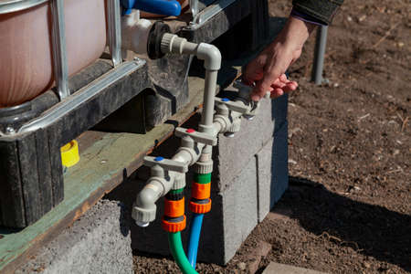 Irrigation system management. A hand opens a tap on the plastic pipes of the garden watering system. A container with water is installed above the pipes