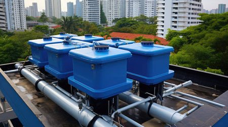 This image showcases modern blue water filtration systems within an industrial setting. The focus highlights various components including pumps and storage tanks, emphasizing technology and efficiency in water management.