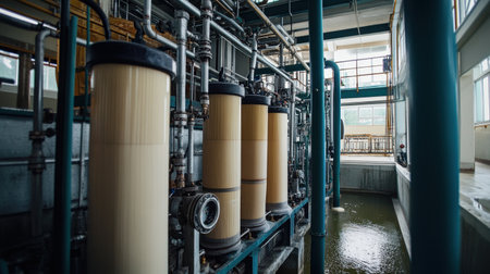 Explore a detailed view of an industrial water filtration system, showcasing advanced filter technology within a contemporary facility illuminated by natural light.