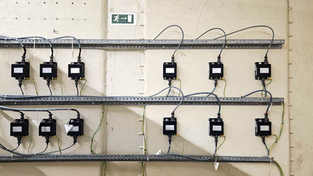 Multiple industrial junction boxes and cable lines neatly organized on wall in automation control room