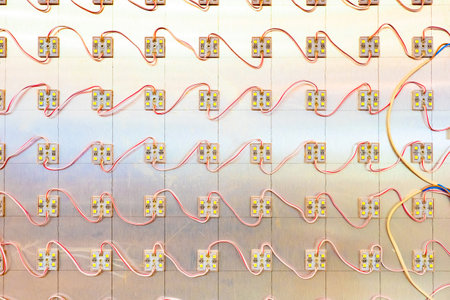 LED modules are located on the wall. Many LED modules are wired. The concept is electrical equipment. Lamps for illumination. Electricity. A modern alternative to heating bulbs