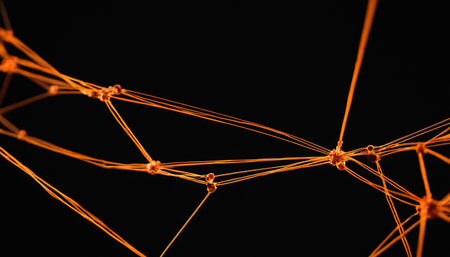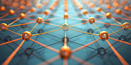 Abstract interconnected network design with orange lines and black circles on a dark honeycomb background, highlighting the concept of connections and communication. Three dimensional elements on a textured surface, creating an engaging visual.
