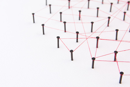 Linking entities, social media, Communications Network, The connection between the two networks. Network simulation on white paper linked together created by black nail and red thread with copy space