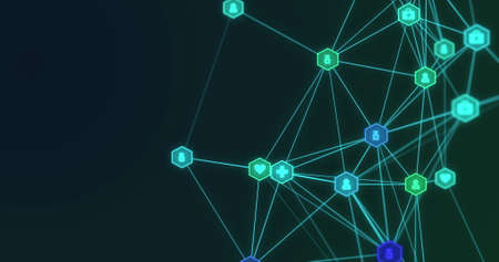This image presents a network of interconnected nodes, illustrated with glowing lines and a futuristic aesthetic. The composition features a dark background, highlighting the blue and green elements of the network. The style suggests digital technology and data flow, suitable for conceptual and commercial applications.