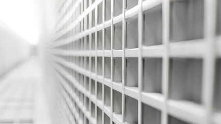 This textured white grid features evenly spaced square patterns, creating a visual play of light and shadow. The clean lines highlight the simplicity and modernity of the design, embodying minimalistic aesthetics.