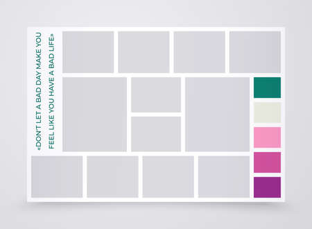 Moodboard template. Mood board background. Photo collage layout. Montage mosaic pictures. Album images grid with color palette and quote. Poster from frames. vector illustration. horizontal layout