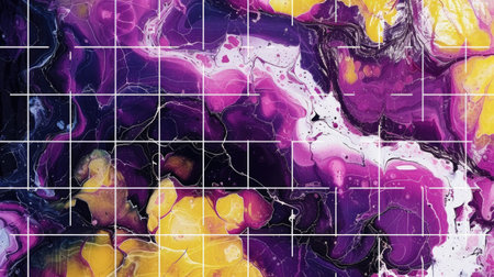 Close up of tiles of marble was painted by abstract color with purple, yellow and white mixed background. Painting was painted with elegance colorful splashing ink brush at light marble tiles. AIG42.