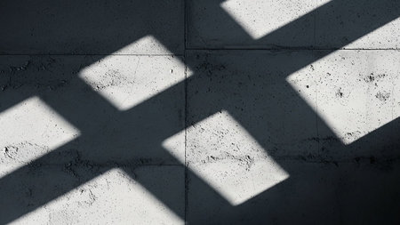Geometric patterns of light and shadow cast across a textured concrete wall surface, creating a stark contrast.