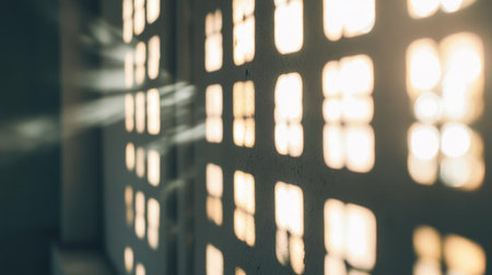A close-up view of a grid-patterned window with sunlight shining through, casting a stark contrast of light and shadow on the surrounding area.