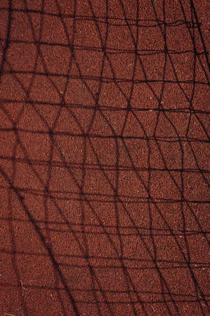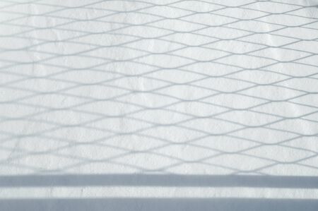 Net shape shadow of metal fence on cement floor. Light spilled through the steel wire of railings on concrete.