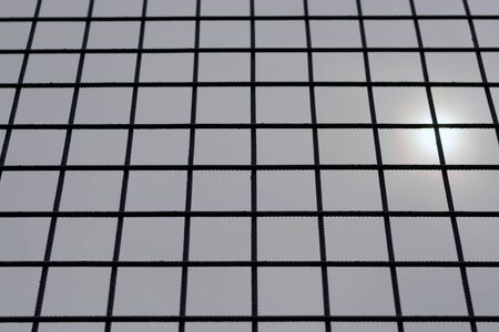 Black metal net fence, against the gray cloudy sky, hiding the sun