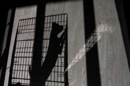 Shadow of a sad dog jack russell terrier in a cage.