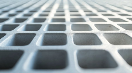 A captivating close-up view of a grid pattern on a modern walkway, showcasing intricate details and textures that highlight urban architecture.
