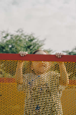 Little girl playing at the playground. Holding the playground fence.