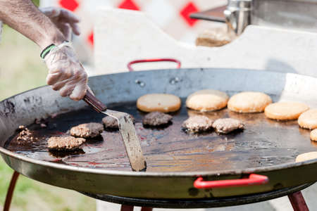 Chef making beef burgersand sausages outdoor on open kitchen international food festival event. Street food ready to serve on a food stall.