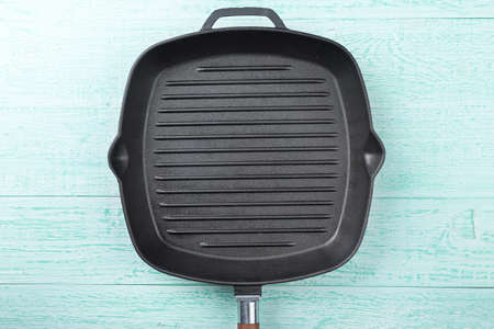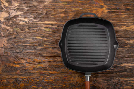 An empty black cast iron grill pan for cooking delicious meat. Wood background. Space for text. Top view.