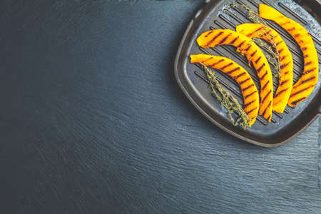 Grilled sliced pumpkin with thyme in dark frying pan on blackstone surface, top view, copy spice.