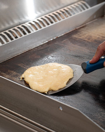 Cooking fresh pancake on black pan