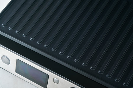 electric grill. Modern kitchen portable grill tool for modern kitchen for grilling meat, vegetables and snacks for dinner or party on light gray background. Place for text or advertisement. Mock up.