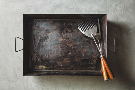 Empty baking sheet with fork and Spatula for Grill, Top view.