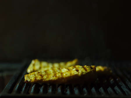 Close up cooking mushrooms on the grill. Champignon white mushrooms grilled on grill or BBQ steam.